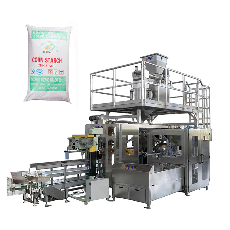 Automatic weighing, automatic bag loading, automatic bag sewing, no manual operation is required; Touch screen interface, simple and intuitive operation; The unit is composed of bag preparation warehouse, bag taking and bag handling device, bag loading manipulator, bag clamping and unloading device, bag holding pushing device, bag opening guiding device, vacuum system and control system;It has a wide adaptability to the packaging bag. The packaging machine adopts the bag picking method, that is, taking the bag from the bag storage, centering the bag, sending the bag forward, positioning the bag mouth, pre opening the bag, inserting the knife of the bag loading manipulator into the bag opening, and clamping the two sides of the bag mouth with air gripper on both sides, and finally loading the bag. This kind of bag loading method does not have high requirements on the size error of the bag manufacturing and the quality of the bag itself Low bag making cost; Compared with the pneumatic manipulator, the servo motor has the advantages of fast speed, smooth bag loading, no impact and long service life;