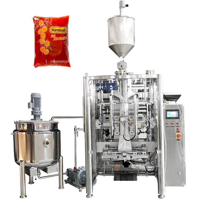 Ĉi tiu unuomaŝino estas speciala dezajno por paki likvaĵon kaj saŭcojn en plastan sakon. La maŝino havas la funkcion de aŭtomata formado de sako, mezurado kaj plenigado de likva produkto. Kun laŭvola funkcio elĉerpi la aeron ene de la sako kaj poste sigeli la sakon. La maŝino ankaŭ havas koloran rubandon por datprintilo por kodigo de eksvalida dato kaj produktadodato. Vaste uzu por paki malsamajn likvajn kaj pastajn produktojn.