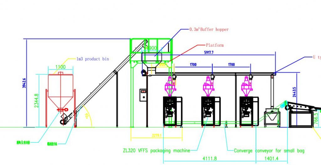 1, Samll-sako formanta plenigantan pakaĵmaŝinon .Ĉi tiu parto inkluzive de la krudmaterialo hopper ,Inklina ŝraŭbo-nutra maŝino .Meza bufro-hopper ,kaj horizontala nutra ŝraŭbo por sendi ĉiujn krudaĵojn al 6 aroj Auger-mezurilo.
