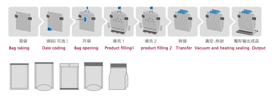 Laborfluo: ensakado → presado de produktadodato → malferma sako → plenigo 1 → plenigo 2 → vakantaĵo → varmega sigelo → formado kaj eligo