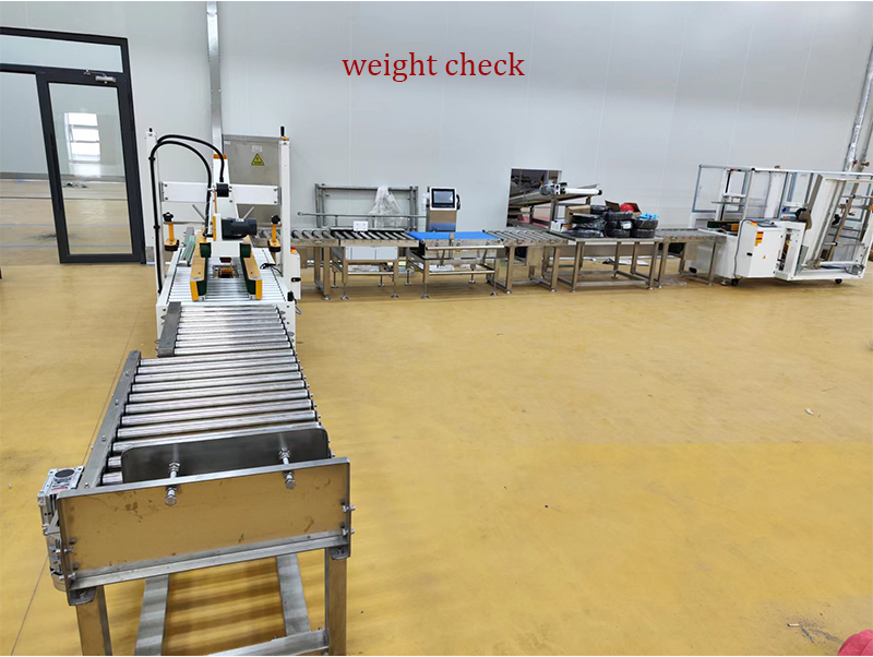Post plenigo de la sakoj per frostita manĝaĵo, ĉiu sako estas rekontrolita per pezodetektilo por certigi, ke la pezo kongruas kun la cela pezo, kaj poste trapasas metaldetektilon por certigi, ke neniu metalo estas miksita en ĉiun sakon. La sakoj tiam estas transportitaj al la kartona pleniglinio.